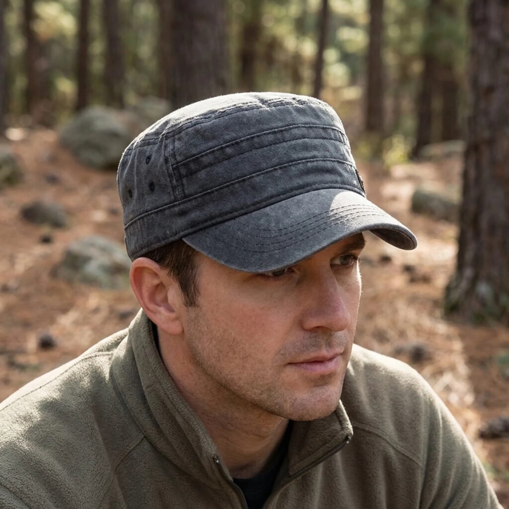 - Stil: Military Cap mit flachem Oberteil